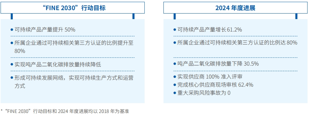 足彩分析 于2018年发布面向2030年的“FINE 2030”可持续发展倡议和行动目标,每年发布行动画册,公布年度各项目标进展及绩效达成情况。