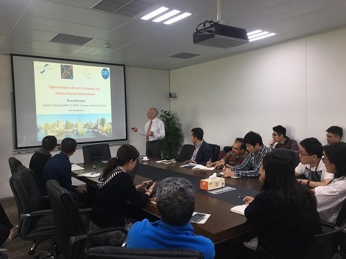 科技创新中心左刚博士、张欣博士等研发人员分别就催化领域的配体设计、中间产物检测等方面提出了相应的问题,皮埃尔·布朗斯坦教授进行了详细解答,并对相关螯合催化体系进行了深入交流探讨。