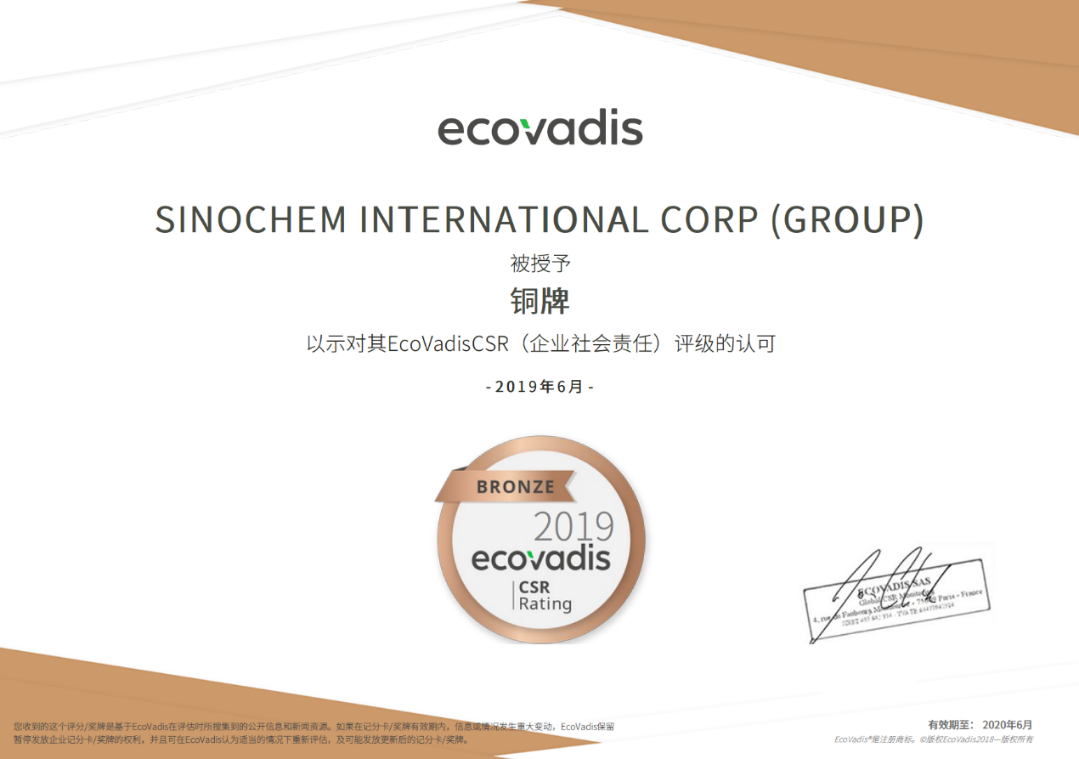 EcoVadis CSR铜牌认证,评审总分处于行业内前30%。