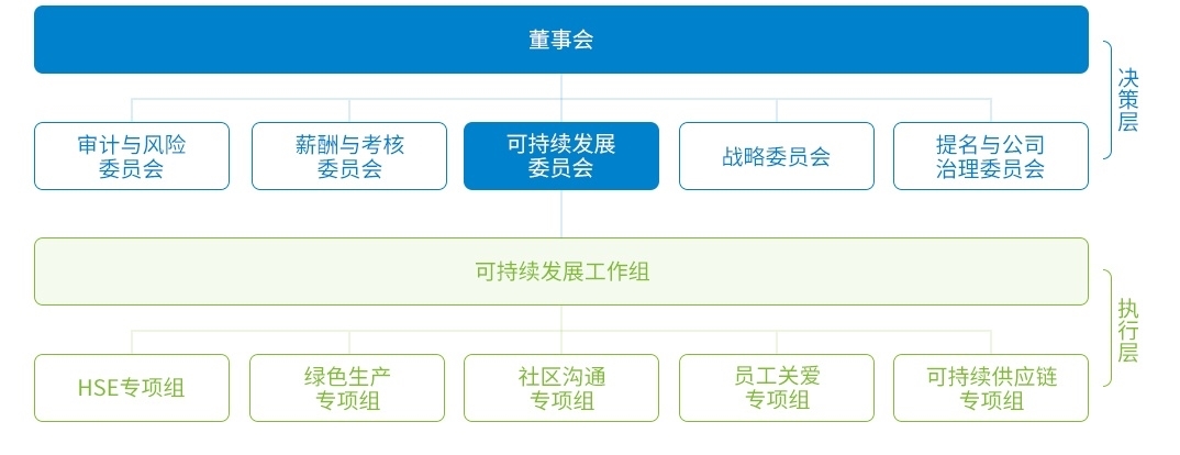 董事长杨华任可持续发展委员会主席,董事、总经理刘红生与独立董事徐永前为可持续发展委员会委员。委员会下设“可持续发展工作组”,并通过HSE、绿色生产、社区沟通、员工关爱、可持续供应链五个专项小组开展具体工作。可持续发展工作组现有20名成员。