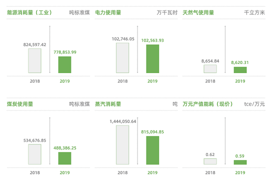 为例,2019年的各项能源使用量就在2018的基础上明显下降。工业能源消耗量减少4.57万吨标准煤,电力使用量减少182万千瓦时,天然气使用量减少3.45万立方米,蒸汽消耗量减少62.9万吨,节约工业用水194.76万吨。