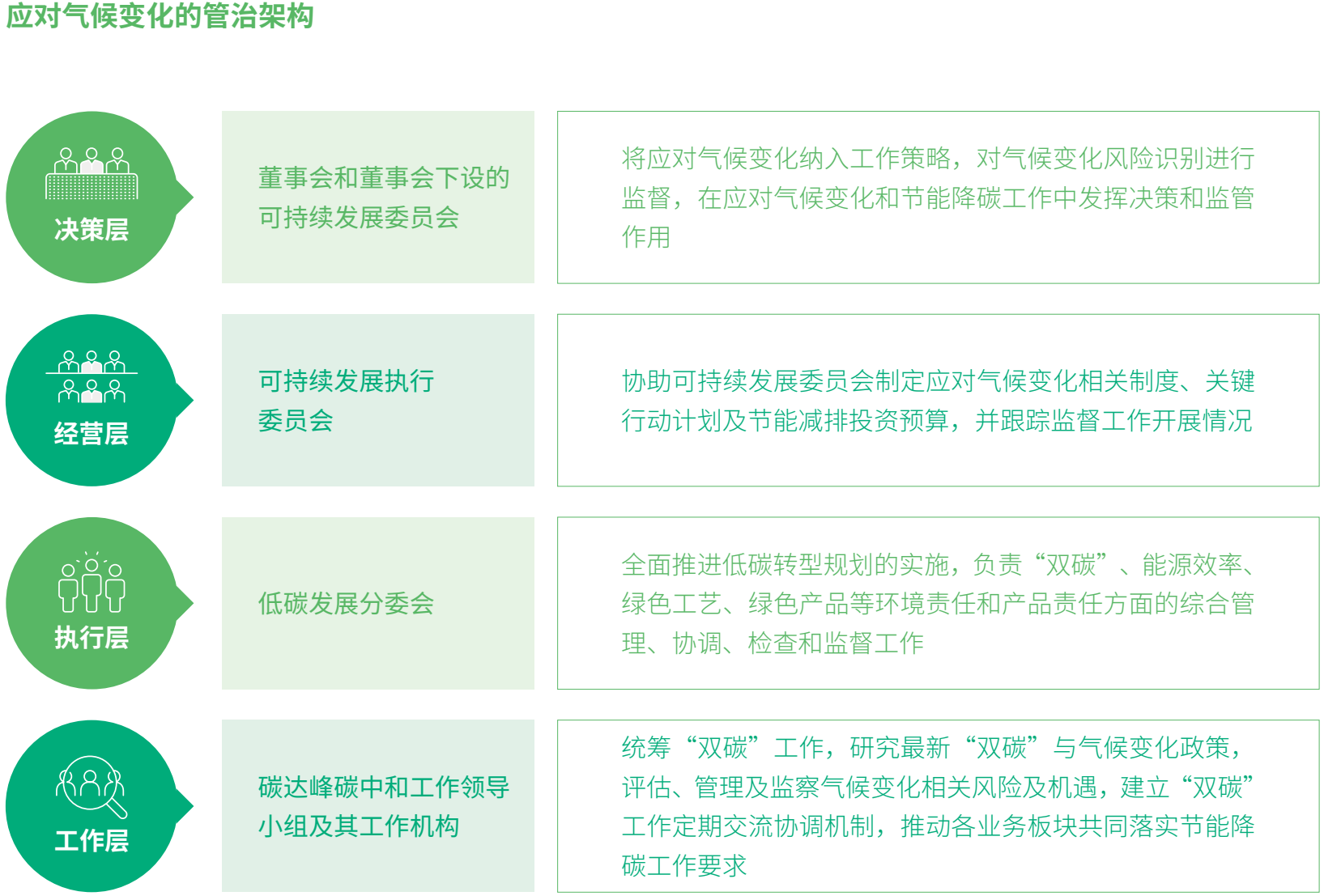 足彩分析 将应对气候变化的管治纳入可持续发展治理架构中,将“低碳发展”作为专项议题进行讨论,从顶层设计出发,自上而下推动“双碳”工作。“双碳”行动方案、目标、举措落实等事项均由董事会负责审议和监管。