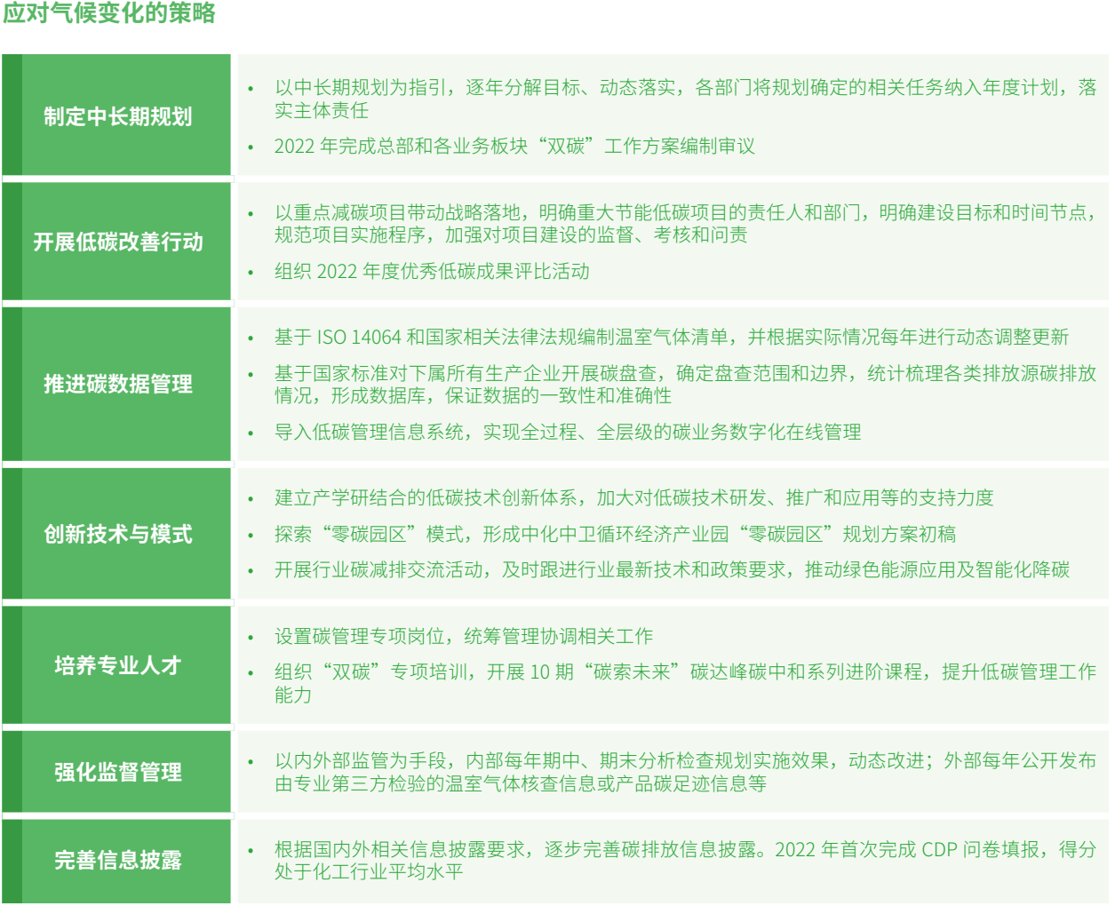 应对气候变化与低碳转型发展已成为全人类共同面临的挑战。足彩分析 积极响应《巴黎协定》1.5℃目标和中国“碳达峰碳中和”目标,参照气候相关财务信息披露工作组(TCFD)建议框架,将气候变化风险纳入公司风险管理体系,制定《碳达峰、碳中和行动方案》,优化碳管理工作机制和行动路径,全面部署低碳转型。