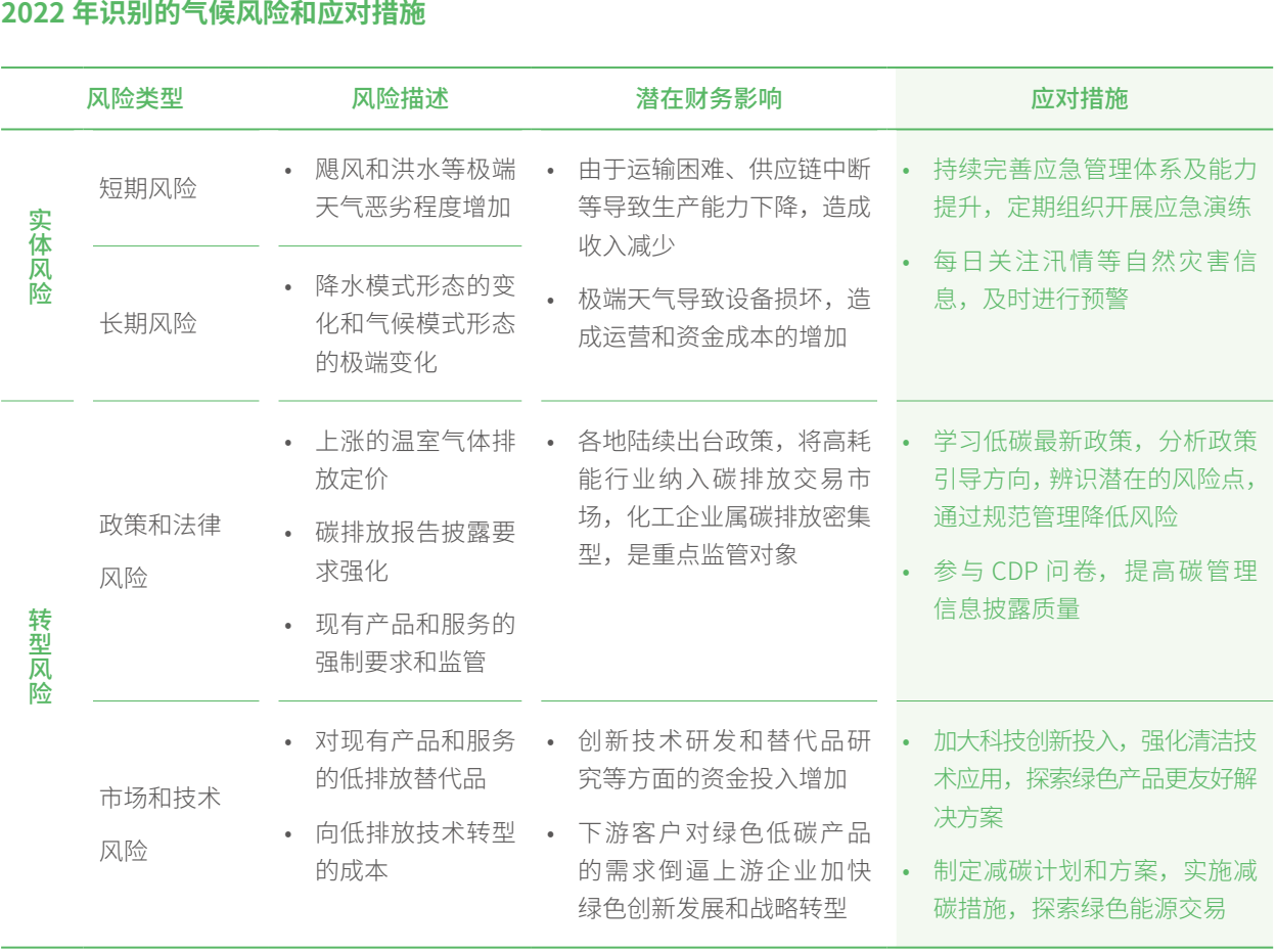 足彩分析 已将气候变化风险纳入公司风险评估和管控体系,系统识别分析公司业务与运营面临的气候风险和机遇,并定期检视更新,前瞻性制定应对的政策与举措,抓住价值创造机遇。