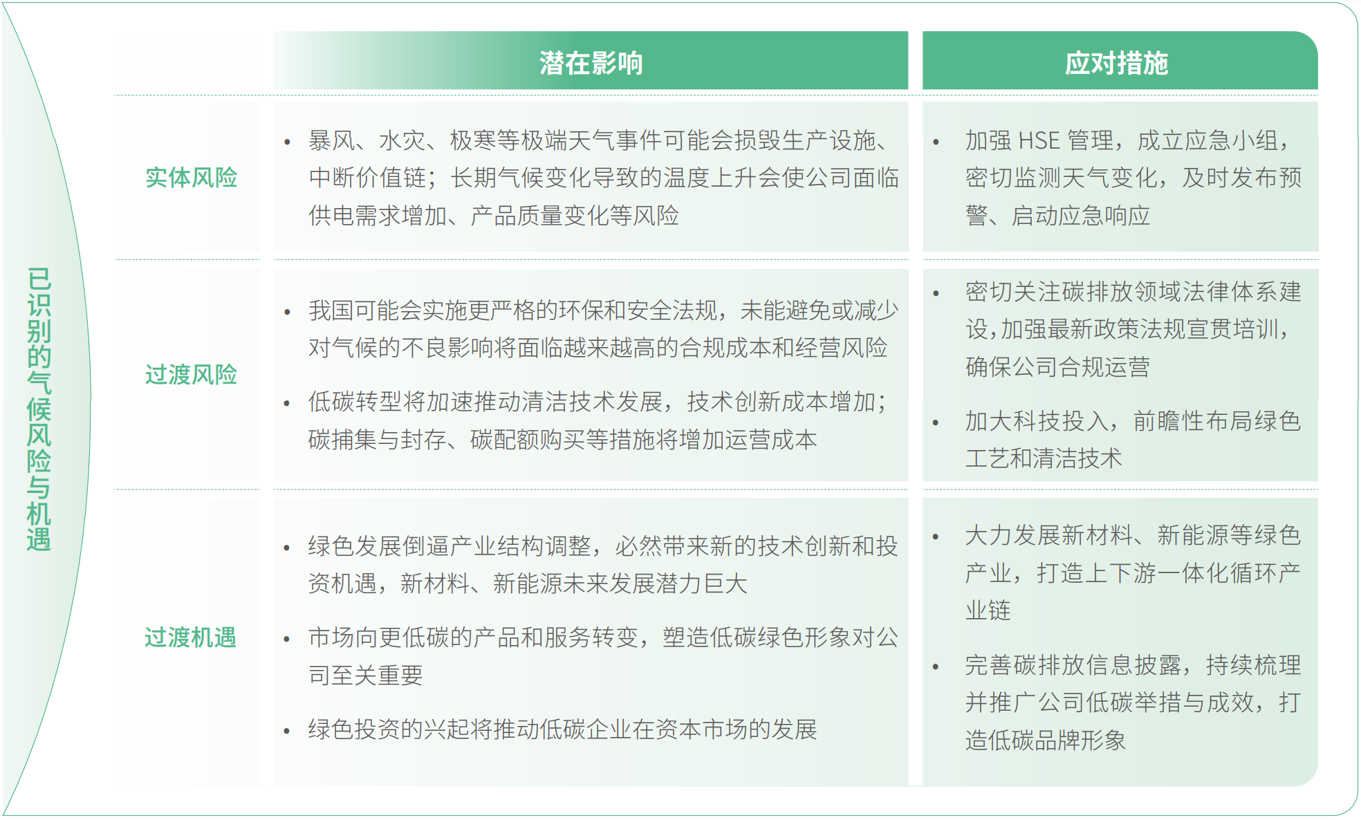 公司结合自身业务发展情况,积极识别、评估气候风险与机遇,并定期检视更新,前瞻性制定应对举措以减缓气候变化对公司业务带来的影响。加强“双碳”工作落实监督,强化各级主体责任,做好各基地节能减排新建和改造项目监督以及碳排放、碳核查业务能力建设。