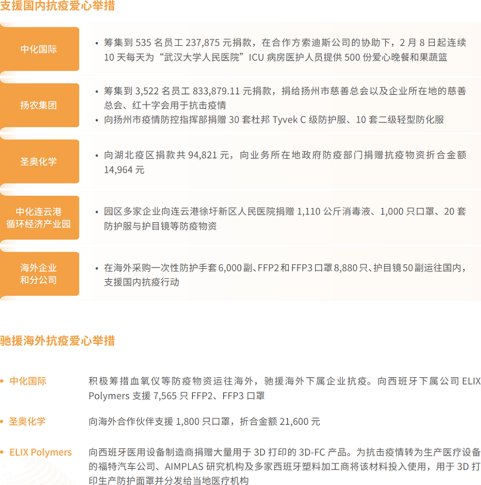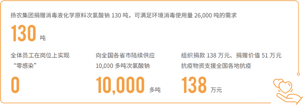 疫情期间,扬农集团累计向湖北武汉、扬州市疾控中心等机构捐赠次氯酸钠130 吨,可满足环境消毒使用量26,000 吨的需求,并向全国各省市陆续供应10,000 多吨次氯酸钠。中 化国际和扬农集团承诺,抗疫期间生产的次氯酸钠一律不涨价。