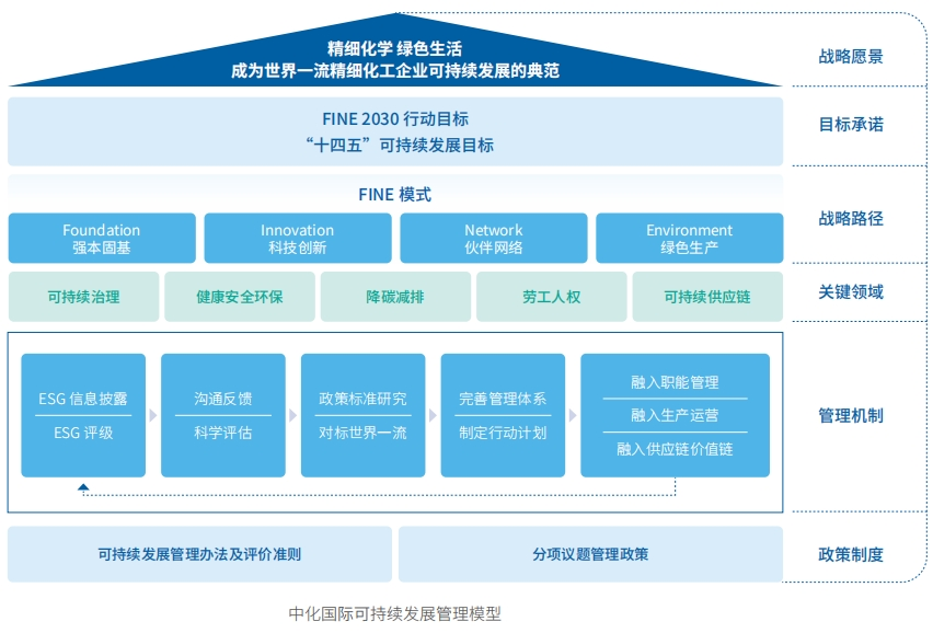 我们围绕“成为世界一流精细化工企业可持续发展的典范”这一愿景,以建设可持续发展管理体系为重点,以信息披露为基础,以外部ESG评级为抓手,形成“以目标计划为导向,以政策制度为基石,以组织架构为支撑,以五大关键领域工作为核心”的可持续发展战略体系与管理模式。