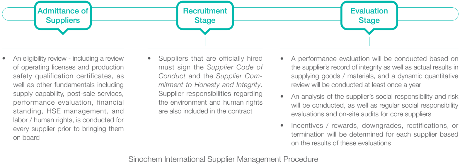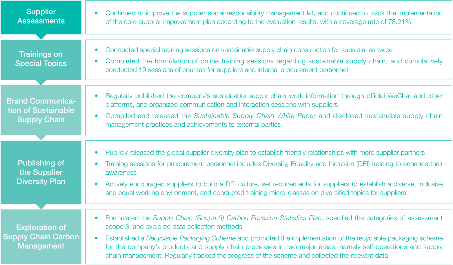 The company implemented whole-process management in terms of supplier on-boarding assessment, classification and categorization, qualification review, performance evaluation and supplier exit, incorporating safety and environment, labor human rights, and social responsibility components into the evaluation criteria. According to the results of the evaluation and assessment, the suppliers will be rewarded, corrected, downgraded or eliminated.