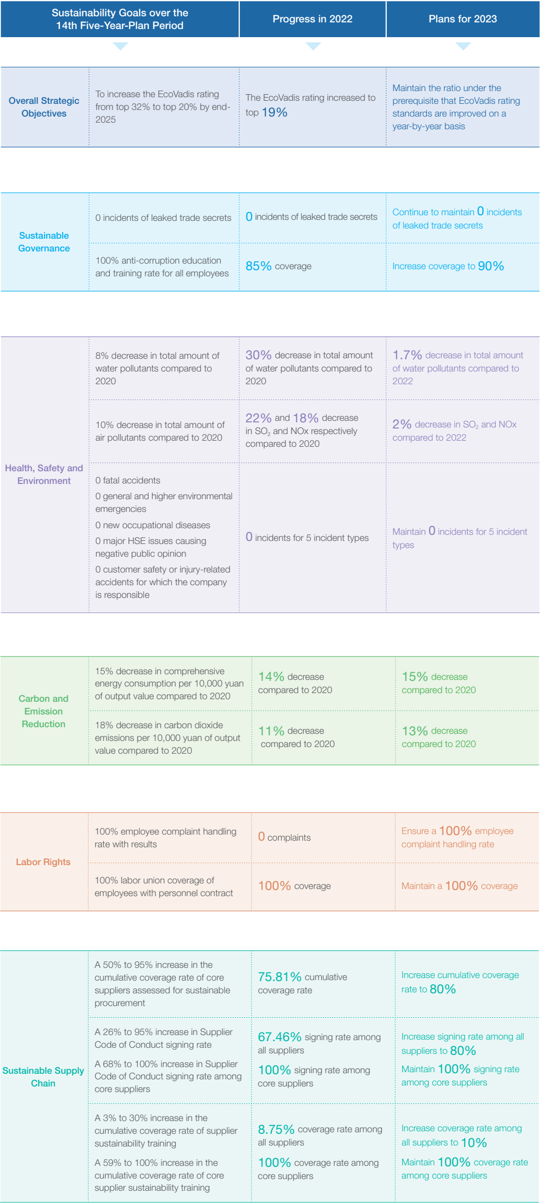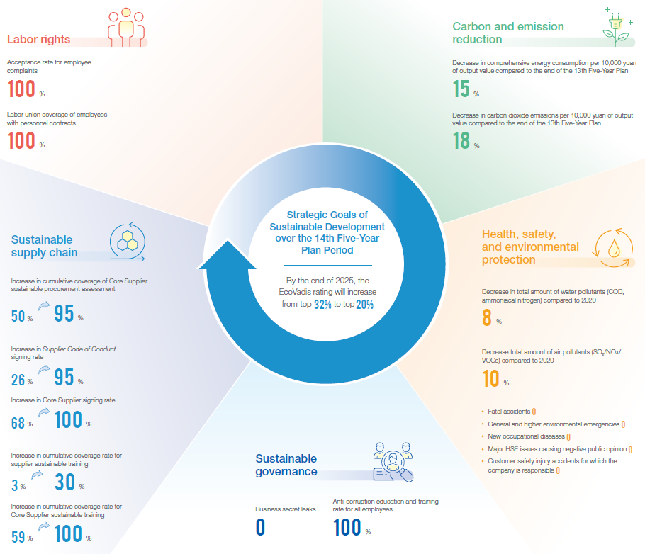 In 2021, the board of directors of the company identified the key areas most closely related to the development of the company based on the new development stage and latest sustainable development trends. These key areas were then used to formulate sustainable development strategy objectives during the period of the 14th Five-Year Plan (2021-2025). Under its sustainable development committee at the management level, the company has set up an executive committee and five professional sub-committees responsible for the implementation of key actions. These committees are required to report to the board of directors regularly. The board of directors regularly evaluates and reviews the implementation and progress of tasks while offering suggestions for improvement. The board is to ensure that goals are achieved according to schedule and the company continually improves its ability to create comprehensive economic, social and environmental value.