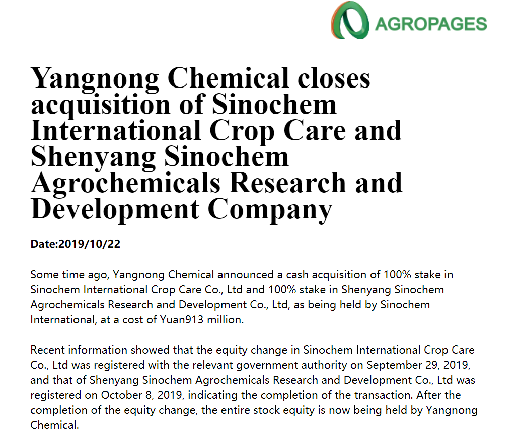 Some time ago, Yangnong Chemical announced a cash acquisition of 100% stake in Sinochem International Crop Care Co., Ltd and 100% stake in Shenyang Sinochem Agrochemicals Research and Development Co., Ltd, as being held by Sinochem International, at a cost of Yuan913 million.