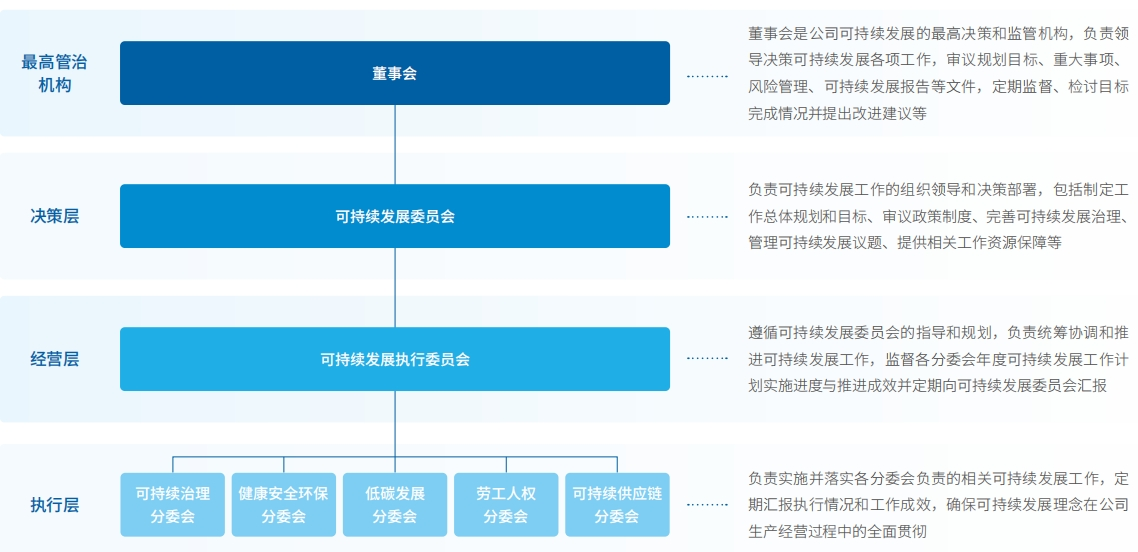 自2020年以来,已逐步建立“董事会-可持续发展委员会-可持续发展执行委员会-五个专业分委会”的ESG管治架构。