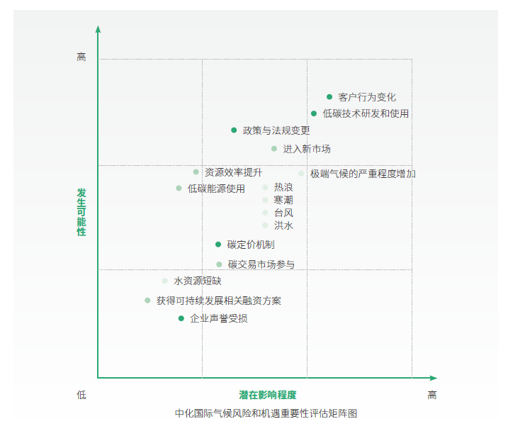 我们制定“3060 降碳路线图”和行动计划,布局净零碳产业链战略规划。报告期内,我们共识别出16项气候相关风险和机遇,对气候风险和机遇开展“发生可能性”和“潜在影响程度”分析,更加全面了解风险和机遇的重要性,以便更好地制定有效的管理措施应对,促进自身和社会发展同频走向可持续发展的美好未来。