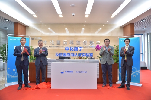 科技创新中心执行董事兼总经理朱建军、张江管委会科技创新处杨福韬、康宁大中华区创新官兼总监姜毅为连续流反应器应用联合实验室的揭牌。